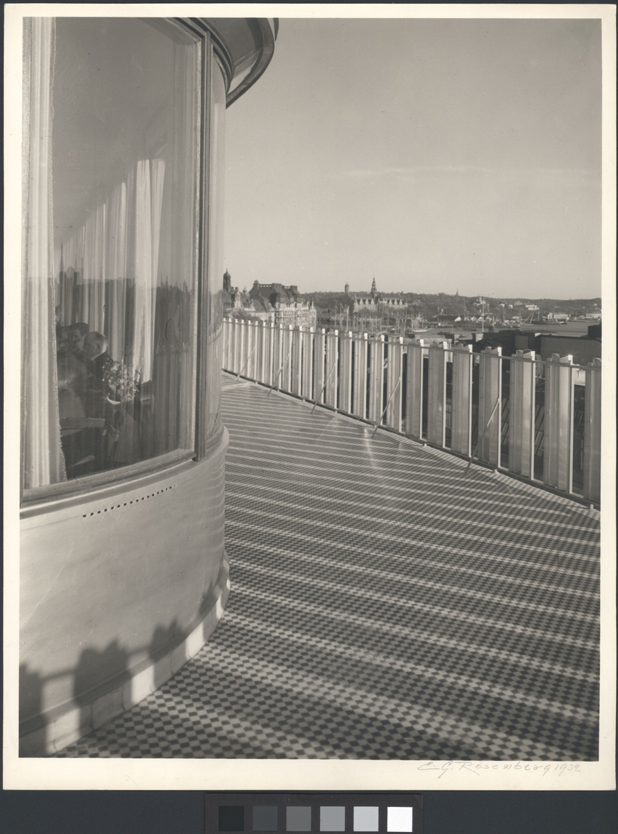 Exteriör. Dagtid. Detalj av fönster och takterrass.