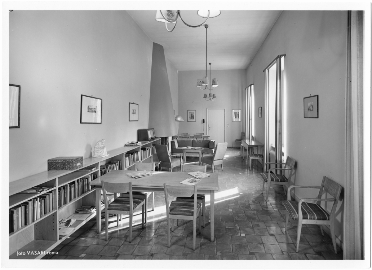 Interiör. Möblerat rum med bord och stolar, bokhylla utmed vägg.