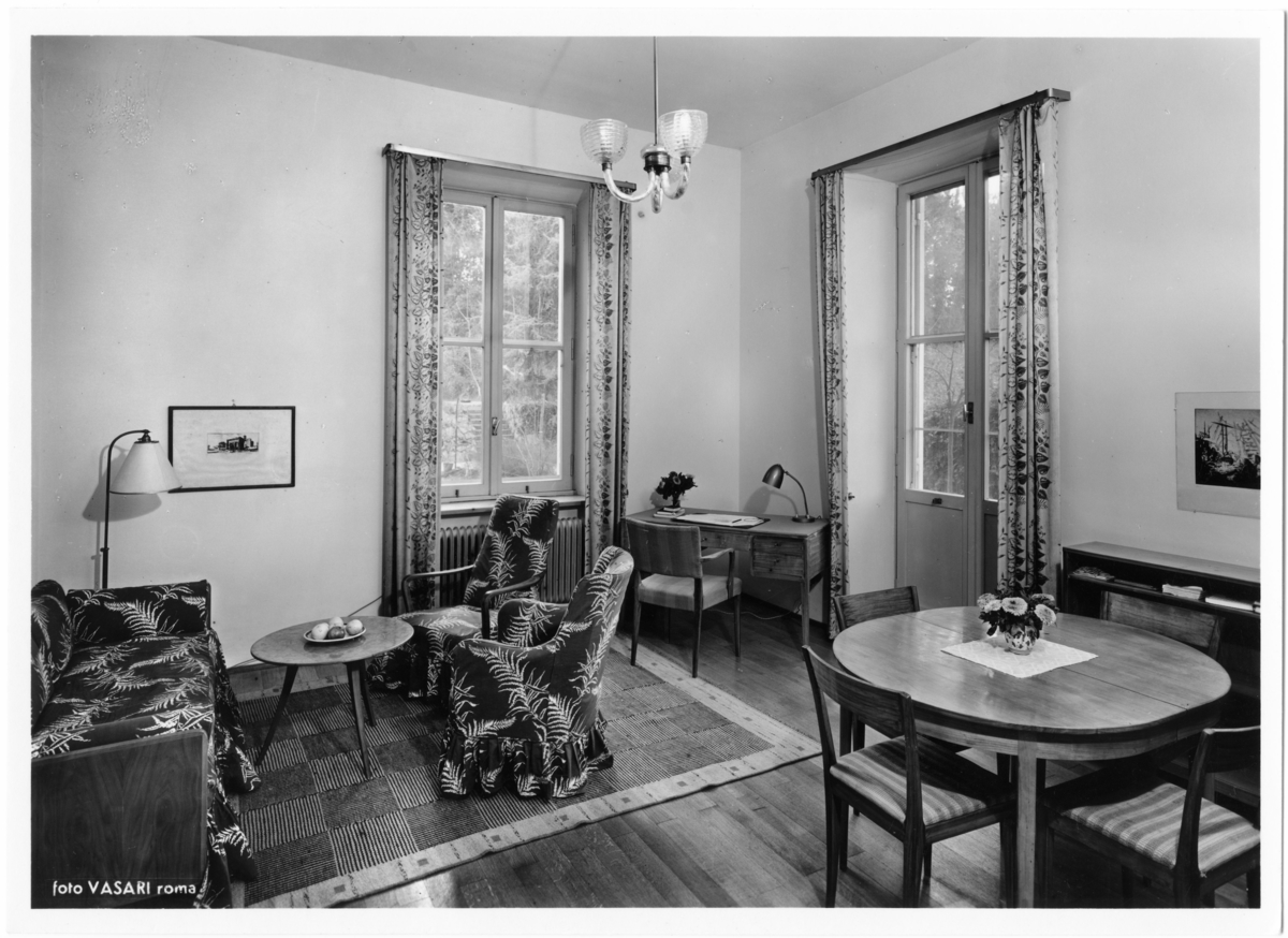 Interiör. Möblerat rum med soffa, bord och fåtöljer.