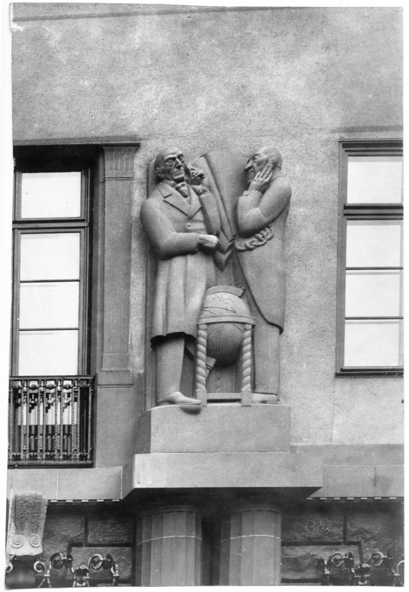 Exteriör. Portik med skulpturgrupp av Carl Milles.