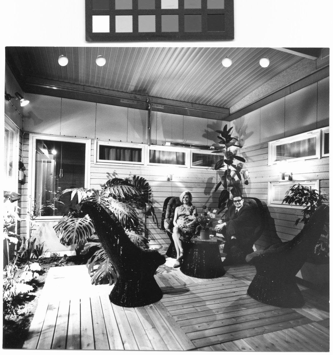 Interiör. En kvinna och en man sittande i korgfåtöljer i vinterträdgårsliknande rum.