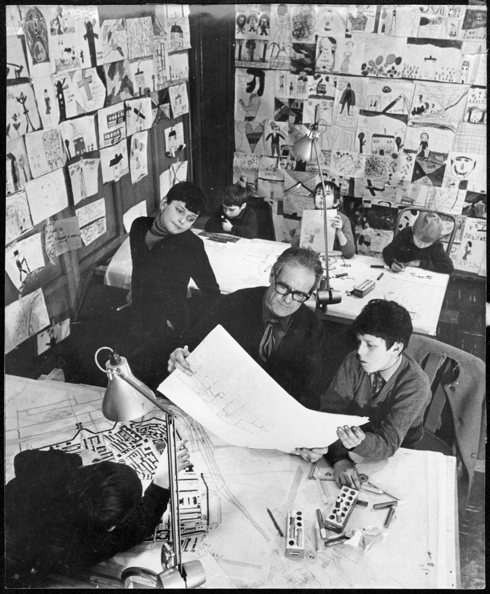 Interiör av ritningsateljén i Byker. Erskine sitter, omgiven av barn, vid ett ritbord.