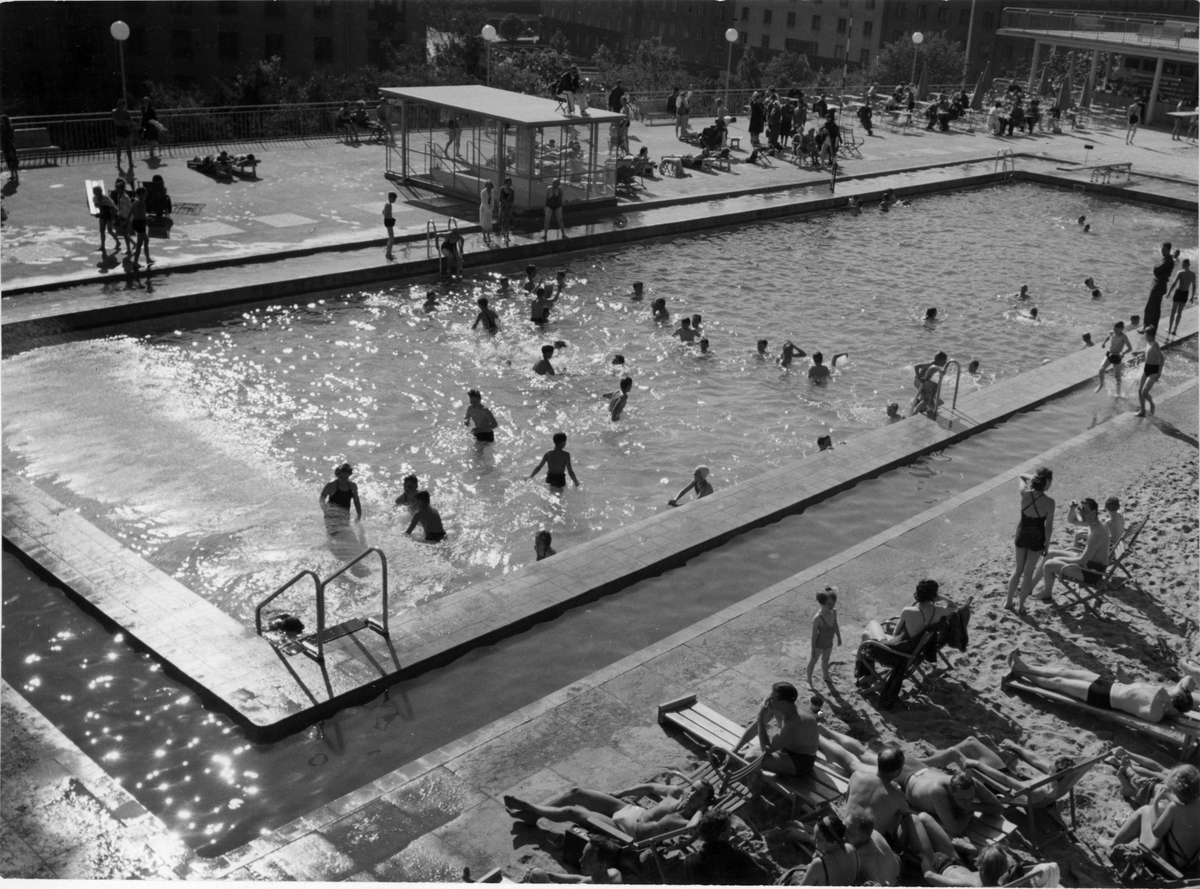 Exteriör. Människor i bassäng.
