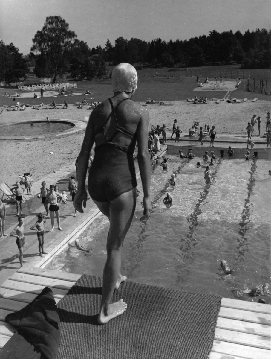 Exteriör. Hopptorn, bassäng, kvinna som skall hoppa.