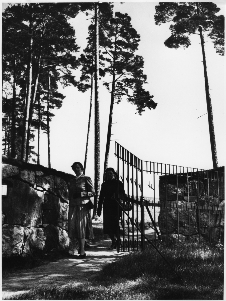 Två kvinnor passerar genom entrégrinden mot väster. fotgängarentré