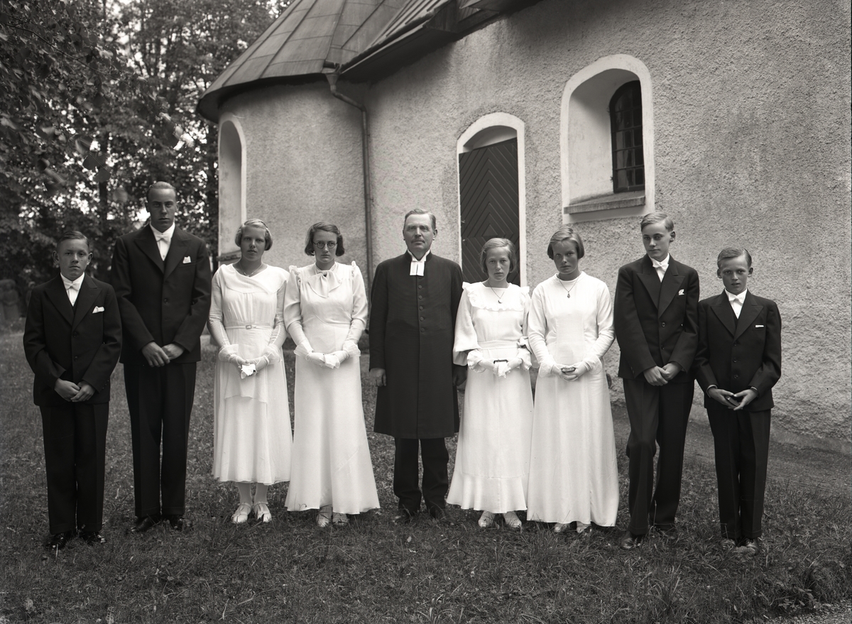 Orig. text: 14 juli. 8 konfirmander i Kaga kyrka.