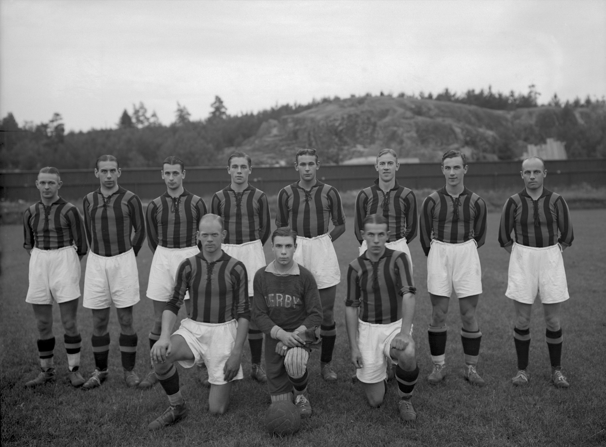 Derbys A-lag 1934. Bilden är tagen på Folkungavallen med gratisberget i bakgrunden. Klubben bildades 1912 av pojkar från Gottfridsberg och Hunnebergsgatan och fick senare flera sporter på programmet som handboll och bandy.