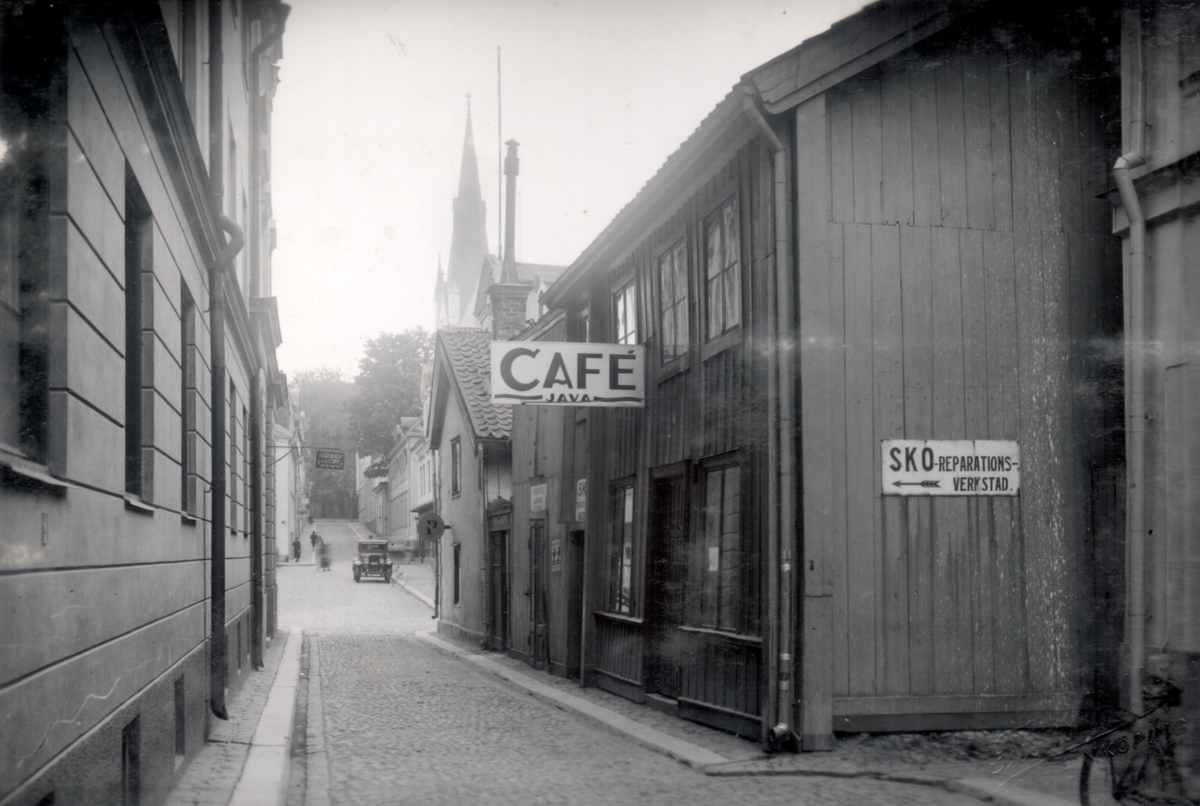 Till höger i bild syns först reklam för en Sko- reparationsverkstad och sedan skylten till Café Java. Ute på Stora Torget står en bil samt en cykel parkerade. På Domkyrkogatan finns ännu ett Café och utanför går några personer. I bakgrunden ser man Domkyrkotornet.