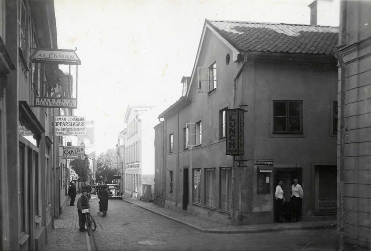 Ågatan vid Hantverkaregatan. Två servitriser står i dörren till lunchserveringen i hörnet Ågatan/Hantverkaregatan.