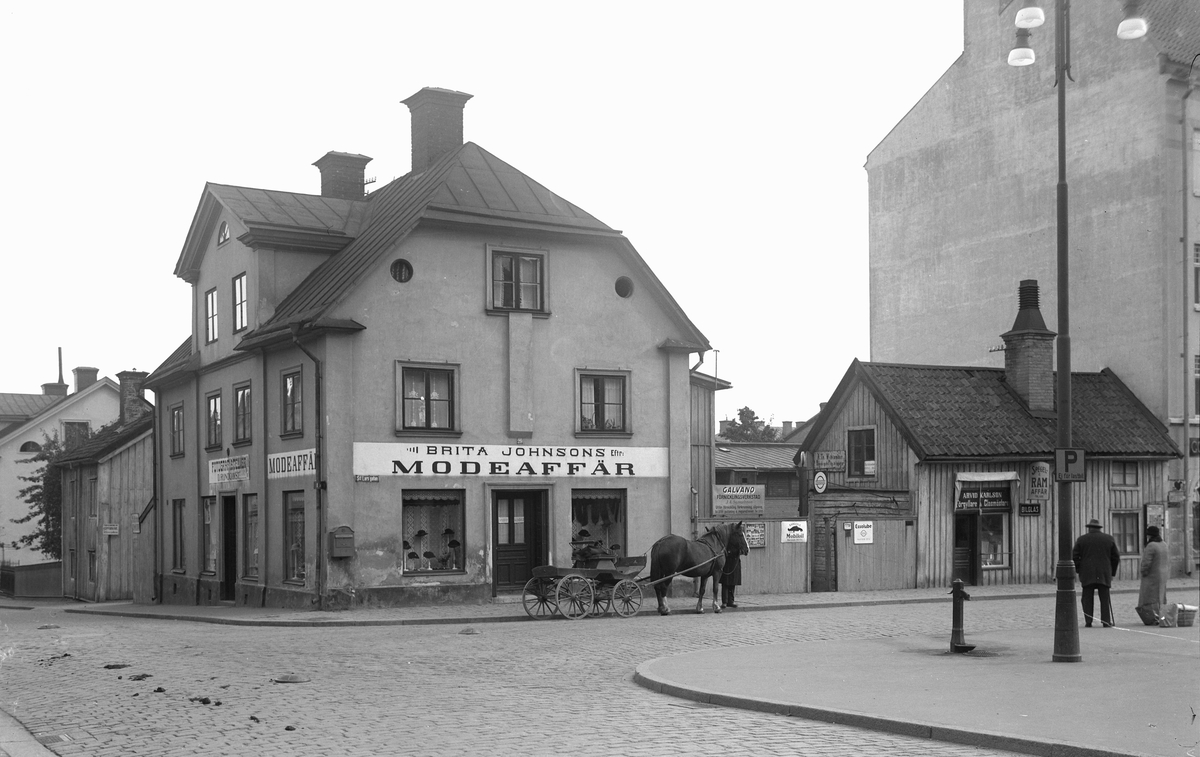Bilden visar en vy över en bit av Trädgårdstorget och Nygatan vilken löper nere till vänster. Gatan som löper till höger är S:t Larsgatan. I byggnaden rakt fram så har fotograf D. Rundquist sin ateljé mot Nygatan till, och i samma byggnad fast med ingång från S:t Larsgatan har Brita Johnson modeaffär. Utmed samma gata har även J. A. Samuelsson en förnicklingsverkstad och Arvid Karlsson ett glasmästeri.