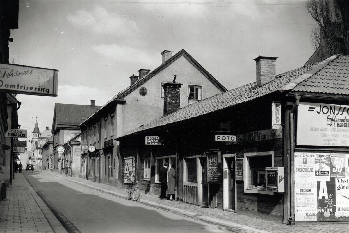 I förgrunden syns en fotoaffär på höger sida och en damfrisering på vänster. Vidare syns bl.a ett finbageri och en järnhandel.