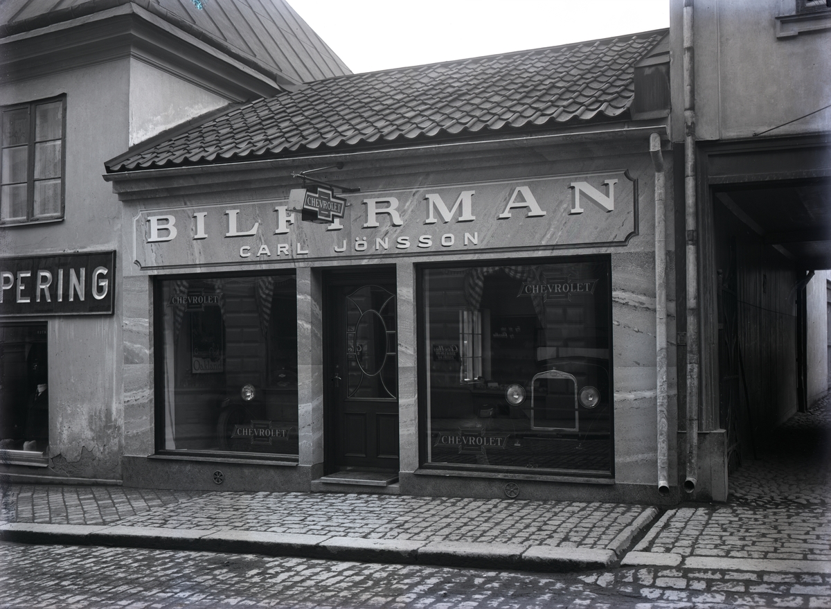 Bilfirman Carl Jönsson på Storgatan 38, exteriör. Skyltfönster med reklamaffischer för Chevrolet.