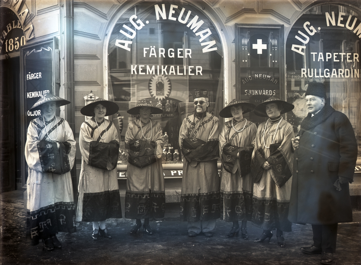 Utanför Aug. Neumans färgaffär. Reklamkampanj för fruktsaltet Mandarin. Troligen är det handlaren till höger i bildkanten.