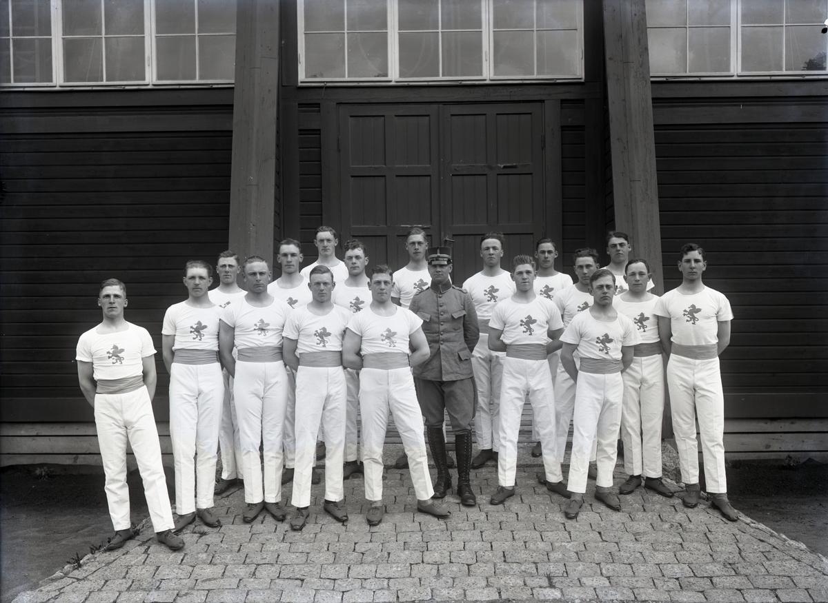 Gruppbild av militärer. Gymnastikklädda.