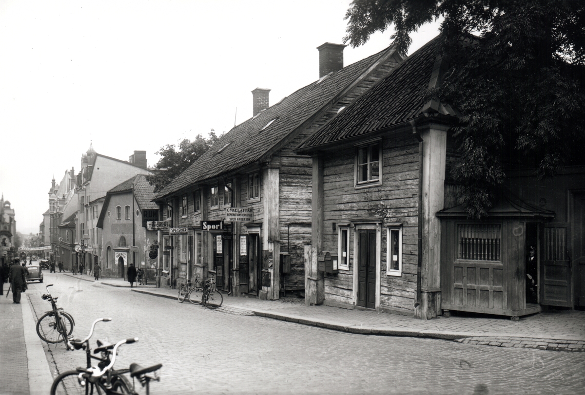 Bilden visar en vy över Storgatan. Fotografen står nästan uppe vid krönet på Storgatan och fotograferar ned mot Stora Torget. Närmast till höger sida syns ett flertal affärer, cykelaffär, sportaffär, specerier och tryckeri i Baron von Lingens gård: Huset flyttades till Gamla Linköping från Storgatan 58. Byggnaden uppfördes av biskop Andreas Rhyzelius på 1720-talet. Den återspeglar den karolinska strävheten - det nakna rödtjärade timret, de smårutiga fönstren med grågröna foder och det valmade spåntaket. Gårdsidan har en liten annan karaktär, den dubbla fritrappan ger den en öppenhet som gatufasaden saknar. Till gården hör en fristående köksflygel. År 1784 köpte friherre Herman von Lingen gården. År 1958 skänkte Östgöta Stadshypoteksförening gården till Gamla Linköping.