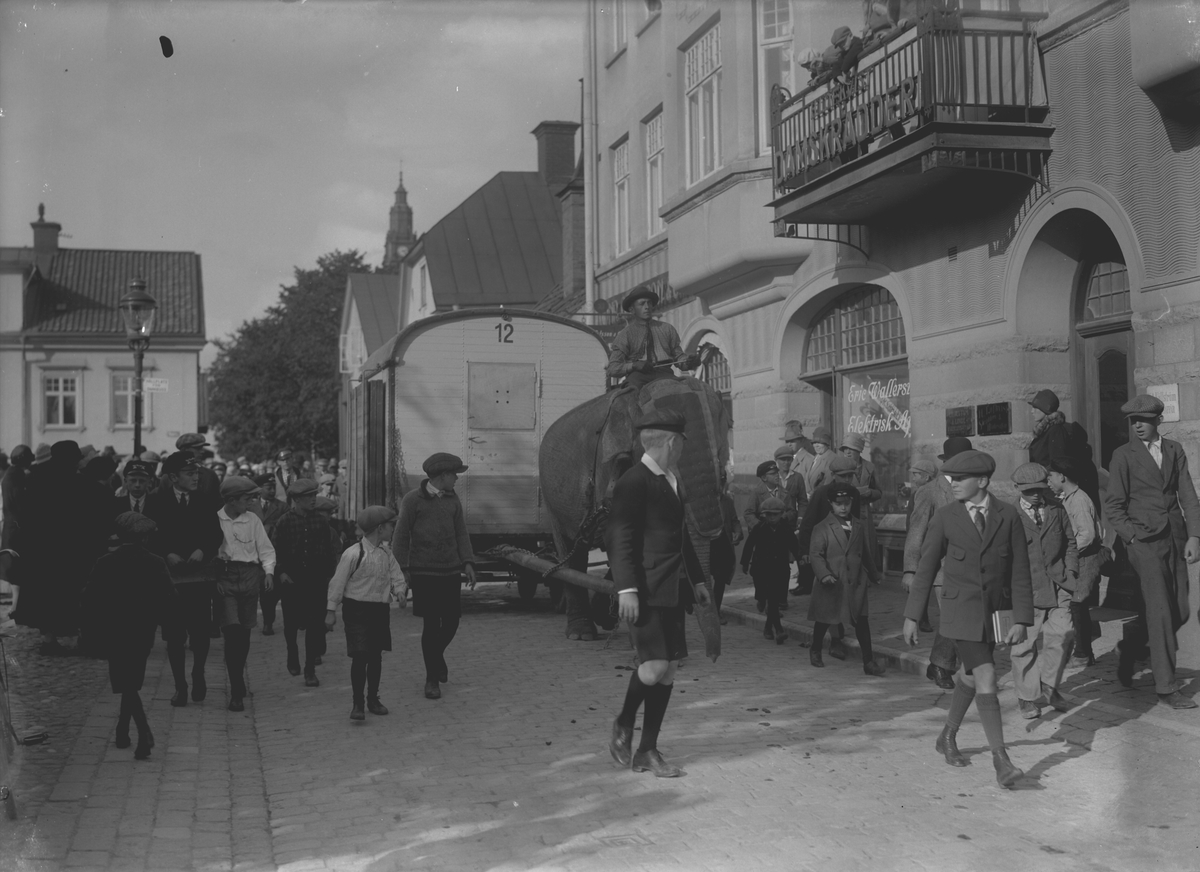 Kortege med en man som rider på en elefant på S:t Larsgatan, vid Trädgårdstorget.
