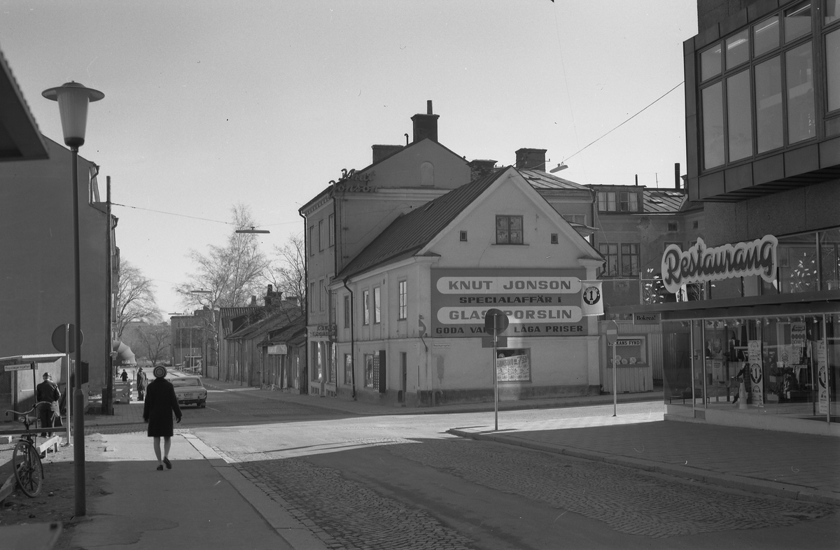 Nygatan sedd mot öster vid korsningen med Repslagareagatan. Närmast till höger det nybyggda Domusvaruhuset. I kvarteret nedanför Knut Jonsons glasaffär.