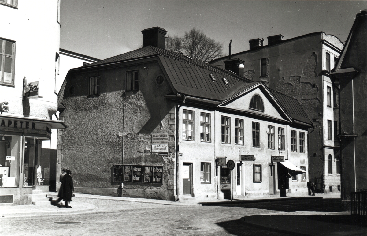 På fasaden mot Läroverksgatan ser man reklam för halstabletter samt Holgers bosättning, en affär med glas och porslin vilken enligt skylten finns belägen på Läroverksgatan 2.