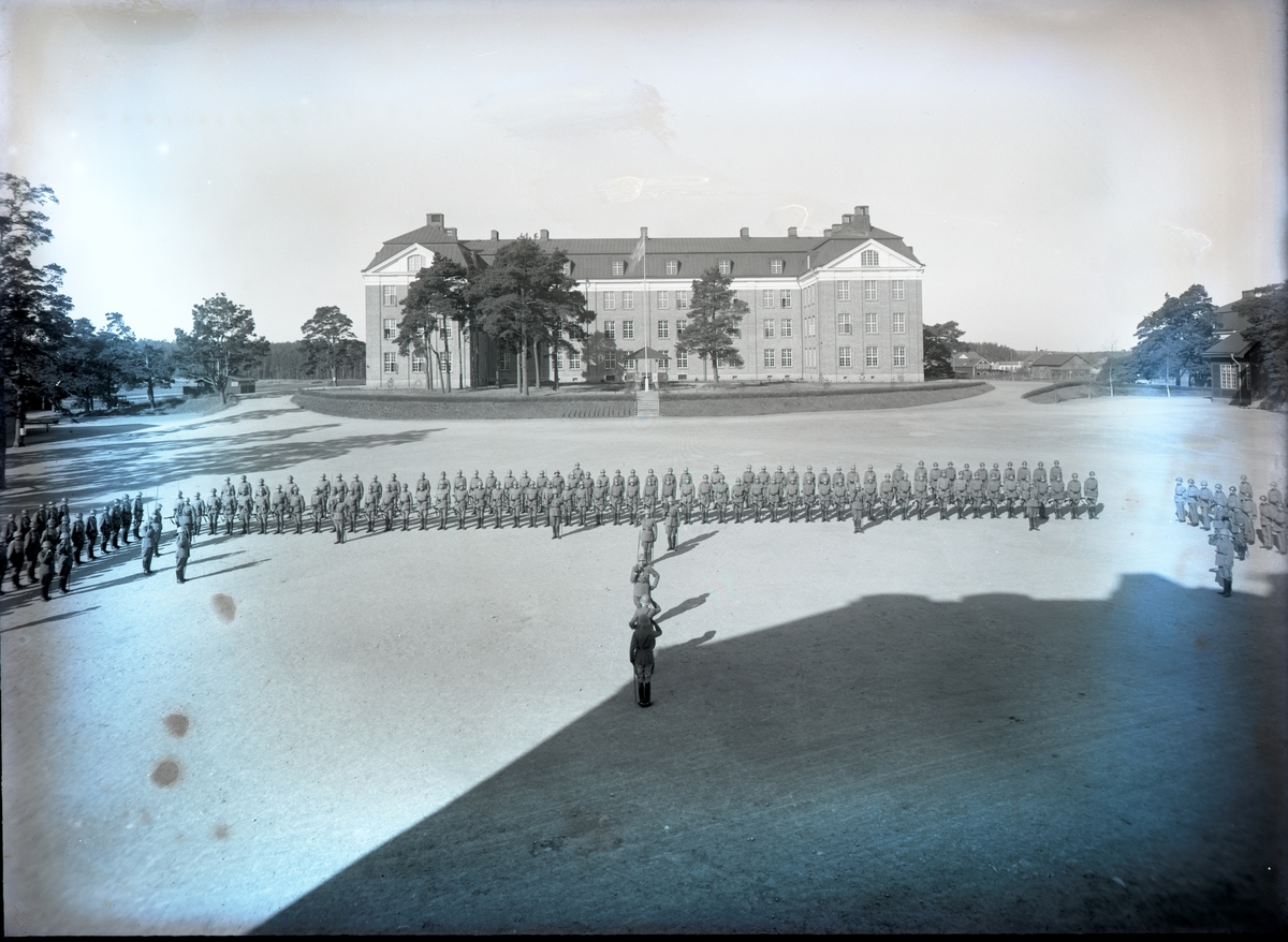 Orig. text: Kungl. Svea Trängkår. Uppställning med hjälmar.