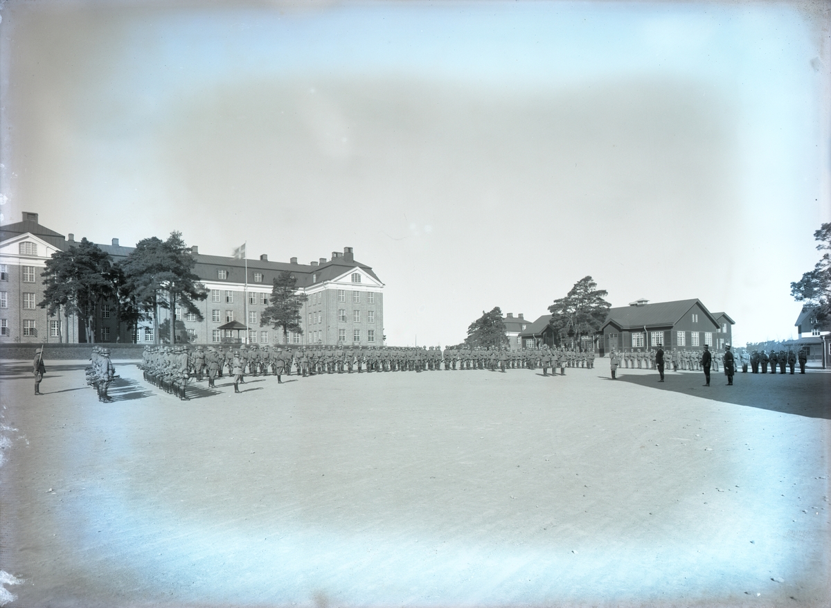 Orig. text: Kungl. Svea Trängkår. Uppställning med hjälmar.