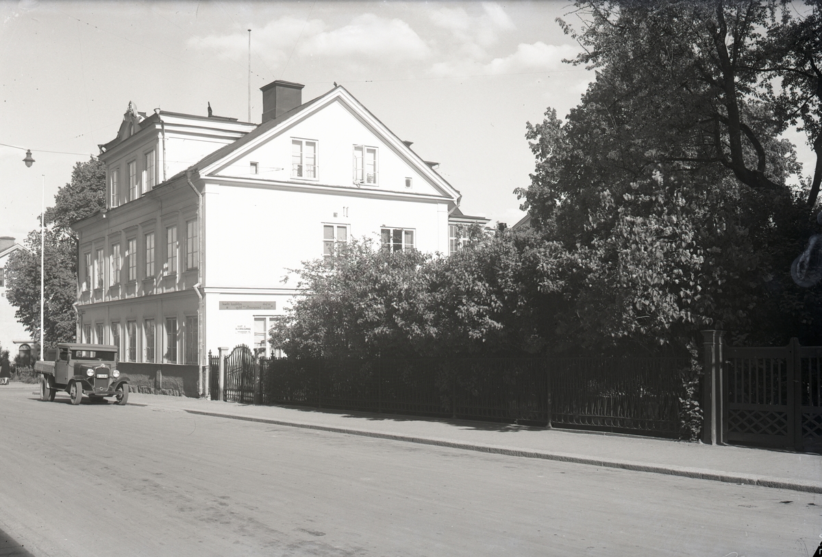 Ing. Åkermans gård. (Dr. Kocks gård). Skyltar på huset: Karin Boström Guld och silversmed, Kapp & Klänningssömmeri.