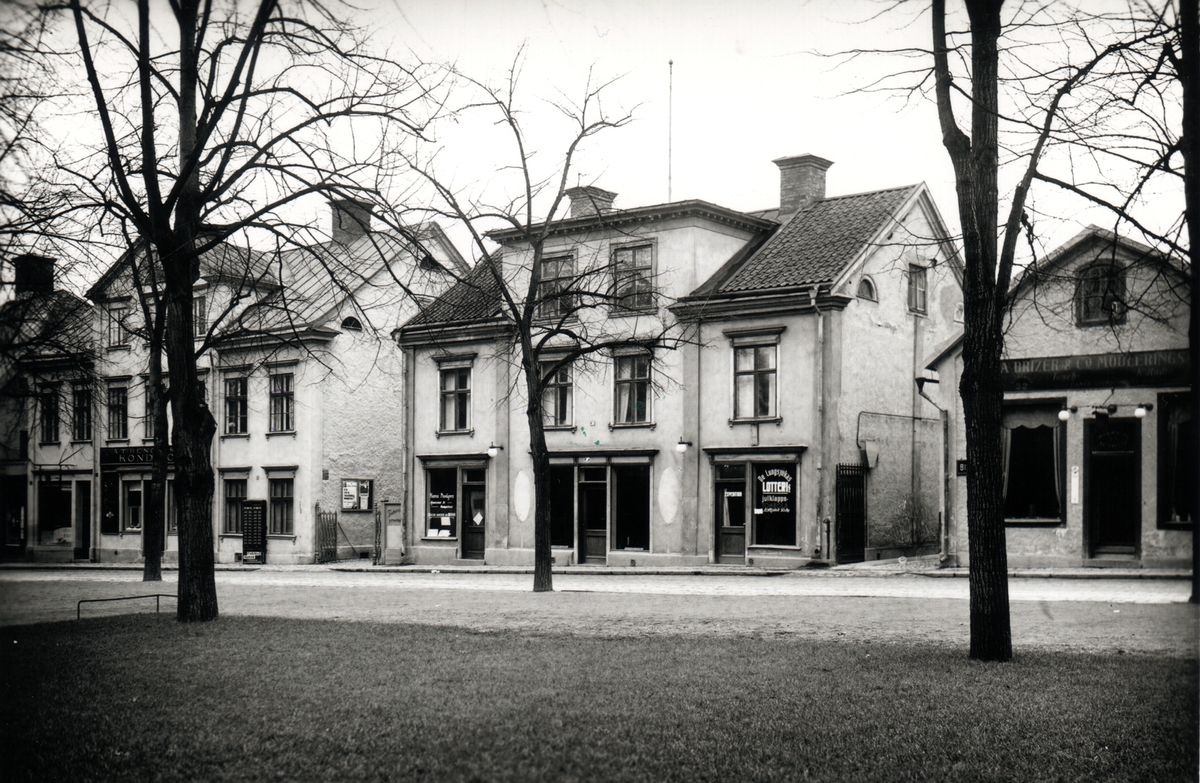 Tre gamla hus längs Storgatan vid S:t Lars kyrkan.