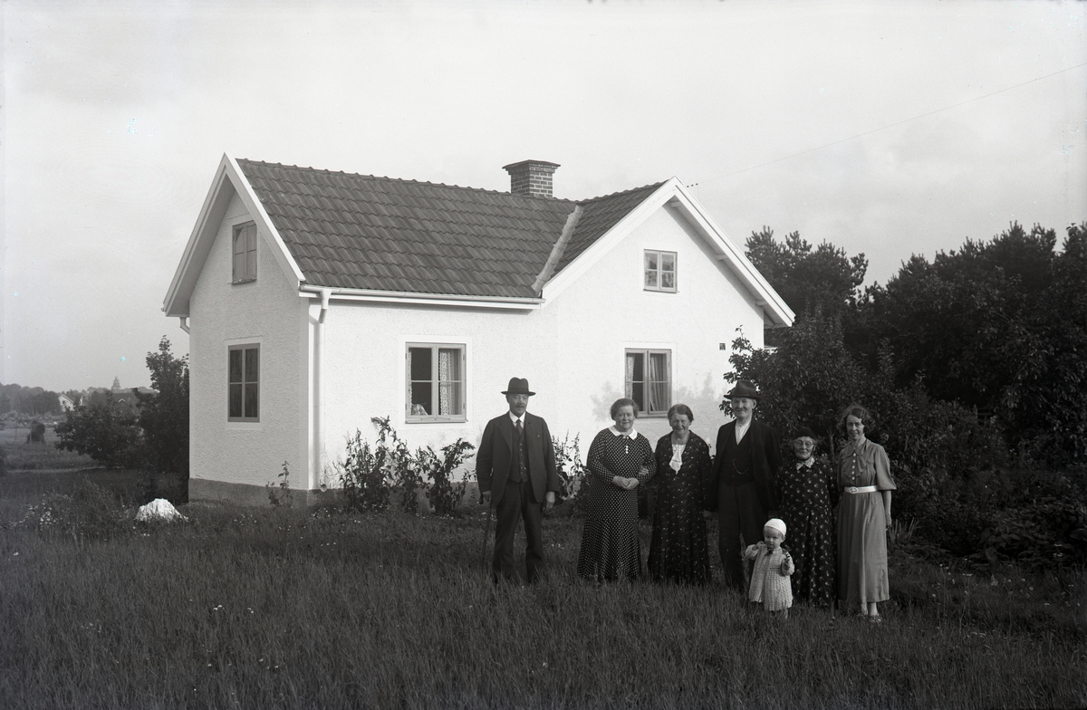 Sju personer står uppradade framför ett mindre hus.