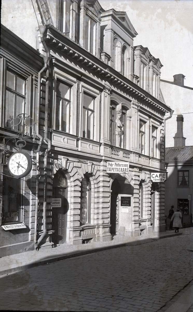 Tanneforsgatan, Café Tomten, Pehr Pettersson Tapetserare, C. E. Hammers Eftr. Läderhandel och A. Wallins Eftr. Ur & Optiska Affär.