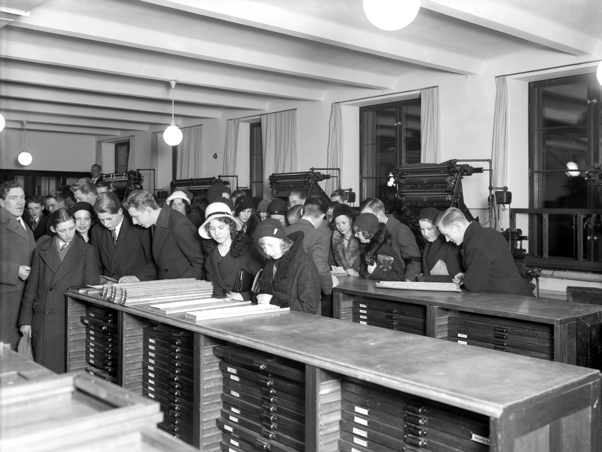 Öppet hus (?) av tryckeri. Troligen Östgöta Correspondentens sätteri med handsättarnas plats längst fram och i bakgrunden syns sättmaskinerna.