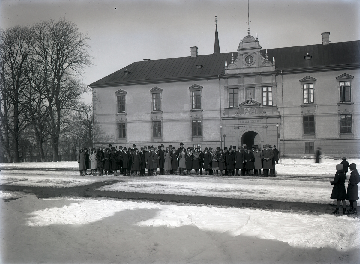 Gruppbild på borggården med slottet i bakgrunden. Kan möjligen vara Nationella Ungdomsförbundet (?)
