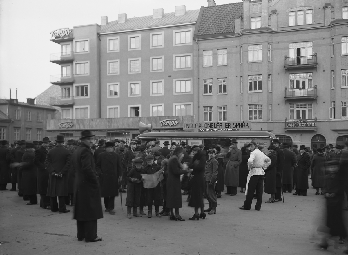 Jippo på Trädgårdstorget. Arrangemanget handlar om att sälja språkkurser via grammofonskivor, Linguaphone.