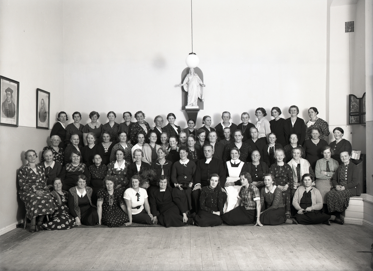 Domprost Sven Carlson med fru Ingeborg sitter mitt i bild. Övriga kvinnor troligen diakonissor, eller möjligen en husmodersförening.