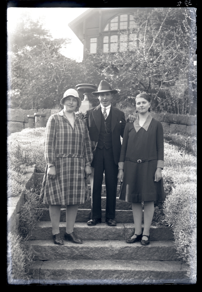 Syskonen Märta, Hilding och Anna Brattberg från Bua, stående på stentrappa med villan på Ramdalen i bakgrunden.