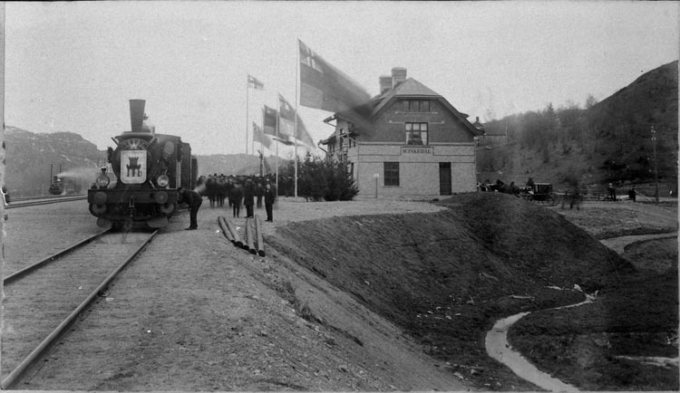 Enligt fotografens anteckningar: "1905, 12. Invigning av Bohusbanan omkring år 1905? Station Munkedal".