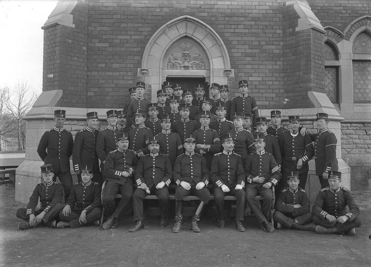 Enligt fotografens noteringar: "Officerer från Kungl. Svea Lifgarde Stockholm fotograferat af Selma Sahlberg fotograf i Munkedal började år 1909 den 16/4 - Bror Sahlberg sittande 4-je raden från höger eller no 2 sittande."
