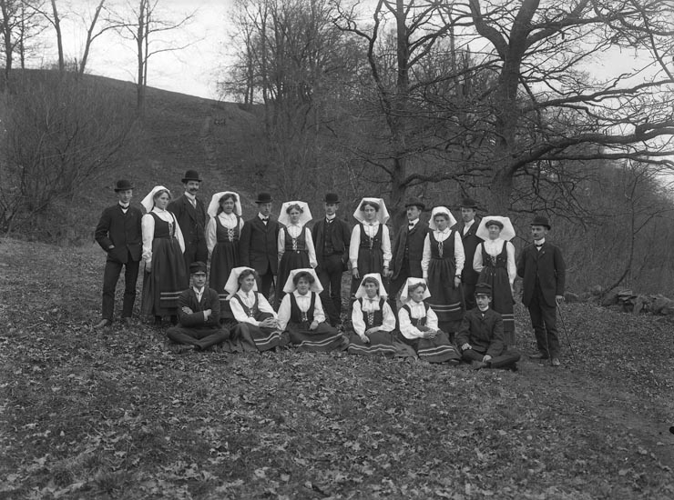 Enligt fotografens noteringar: "Folkdanslag i Munkedal omkr. 1910. Flera kända ........ V.L.A. Karlsson, Larsson, Schewenius?"