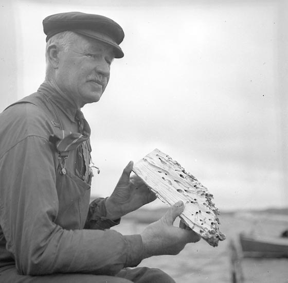 En man sitter med en bit trä i handen, troligen angripen av skeppsmask. I bakgrunden syns sjön och några mindre båtar.