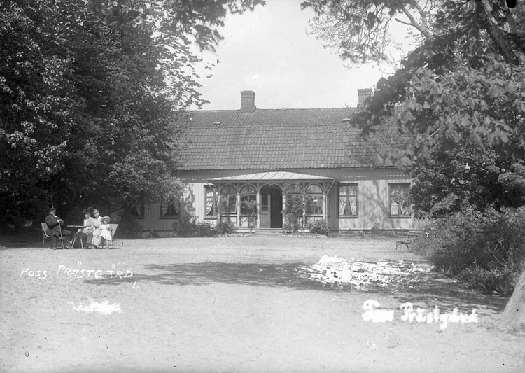 Enligt fotografens anteckningar: "Foss prästgård från 1912. Kyrkoherde Kajander med familj (med fru & dotter Hedda) framför prästgården".