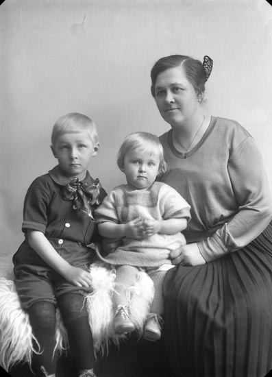 Enligt fotografens noteringar: "Fru Nanna Karlsson med söner gift med Folkskollärare Axel Karlsson. Lycke Skola i Foss socken."