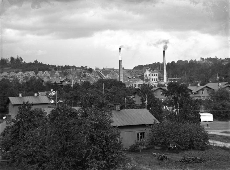 Enligt fotografens noteringar: "Munkedals fabrik 2 skorstenar omkring år 1927?"