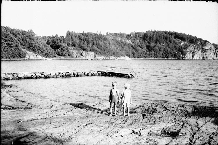 Enligt fotografens anteckningar: "1943, 46. Bertil o Kerstin Schewenius vid Röds brygga vid Torreby badhus".