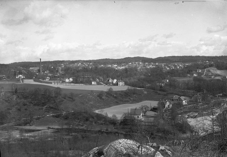 Enligt fotografens noteringar: "NO. 17. Utsikt från Lilla Foss. skogen därifrån ...? vid järnvägen. 195. ...? över Möe, Munkedals fabrikssamhälle."