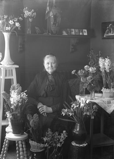 Enligt fotografens noteringar: "Fru Lindberg Munkedal en gammal treflig dam som jag ofta gästat, Selma Sahlberg, Maka till Verkmästare Lindberg."