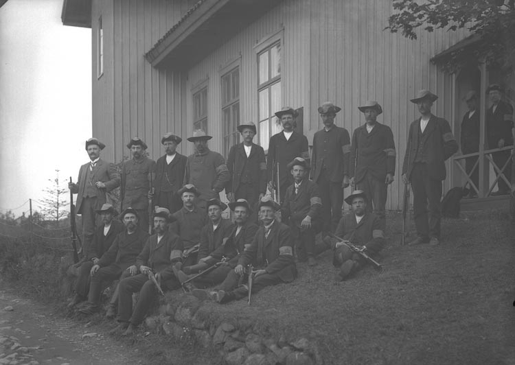 Enligt fotografens noteringar: "Landstormen i Munkedal vid förrådet."