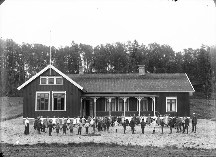 Enligt fotografens anteckningar: "Önnebacka från 1910? Folkskollärare V. Lindqvist, Gottfrid Vinberg Mö skolrådsledamot och lärarinnan Fröken Hanna Larsson."
