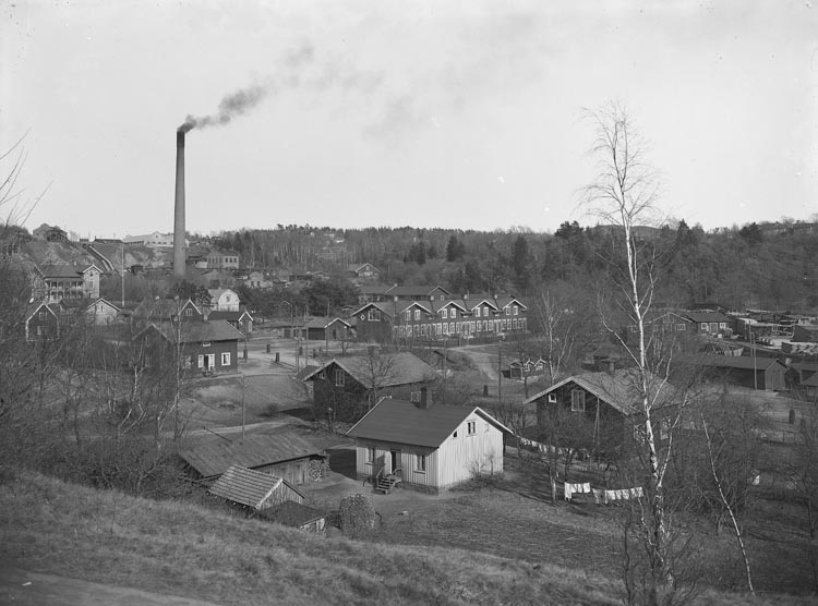 Enligt fotografens noteringar: "Munkedals fabrik med en del bostäder/gammal plåt - omkr 1910."