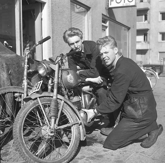 Två unga män undersöker en motorcykel utanför Nils Svenssons Cykel och Motor