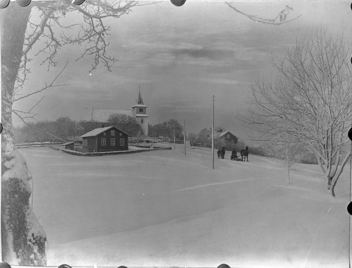 Enligt fotografens noteringar: "Foss kyrka i vinterskrud omkring år 1920. Personerna Oskar Johansson i Stene Aug. Hansson i Berg."