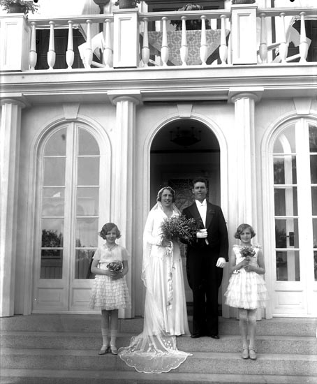 Text som medföljde bilden: "1931. 64. Herrgården Mkl. Brudpar på trappan."