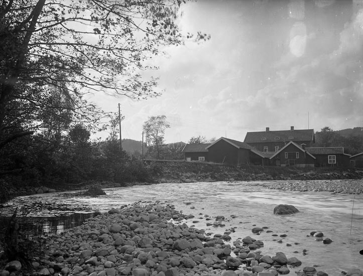 Text som medföljde bilden: "Hedeholm från Älven baksidan på Ek. byggn. Ladugården-källarvind-drängstugan. Mangårdsbyggnaden under påbyggnad med tredje våning. C G Johansson sålde gården till MAB som byggde på tredje vån. och anv. huset som bost. för anst. Under kriget militärförläggning smeknamn "Grini".